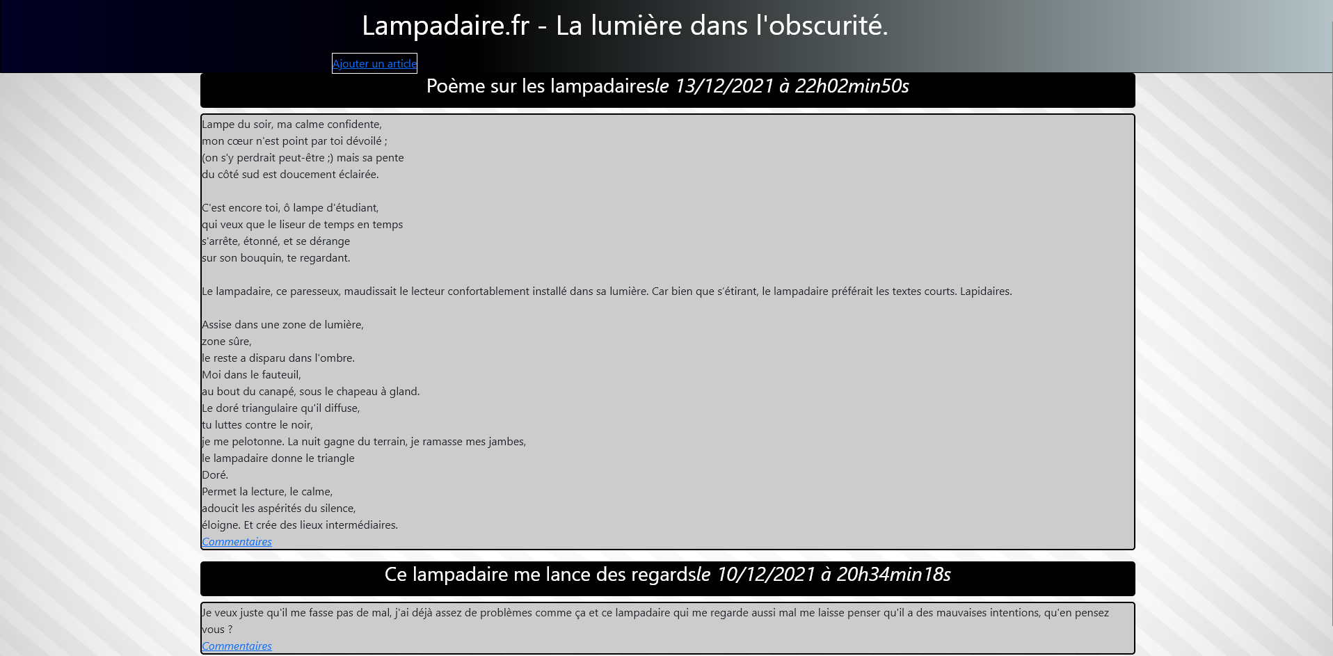 Site lié à une base de données MySQL, avec un système d’inscription et de connexion. Les utilisateurs peuvent publier et consulter les publications qu’eux même ou d’autres utilisateurs ont publié. Ils peuvent également poster des commentaires pour donner leur avis sur la publication.