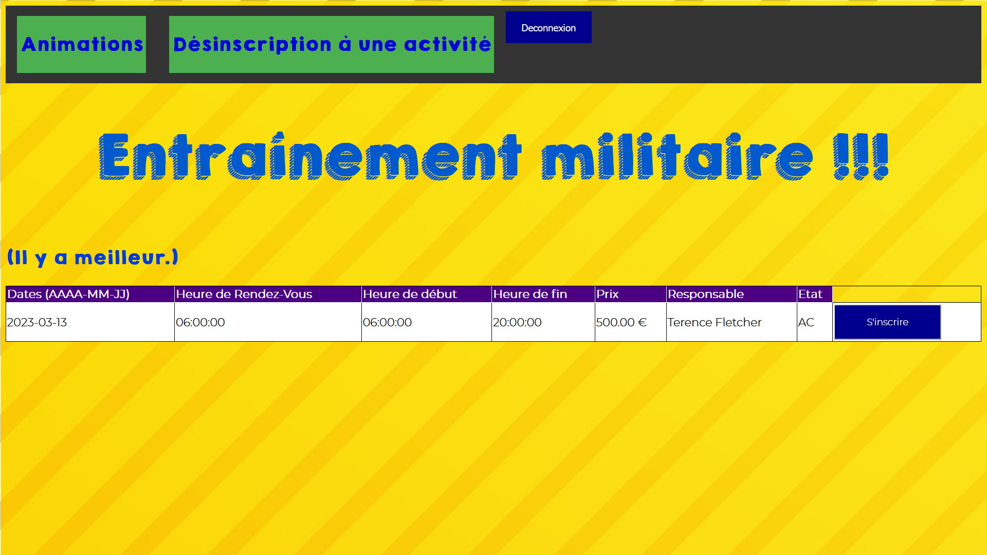 L’utilisateur saisit un numéro d’inscription et accède à une inscription au planning des activités.