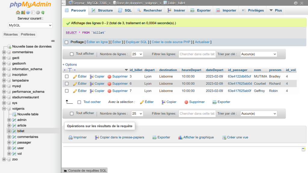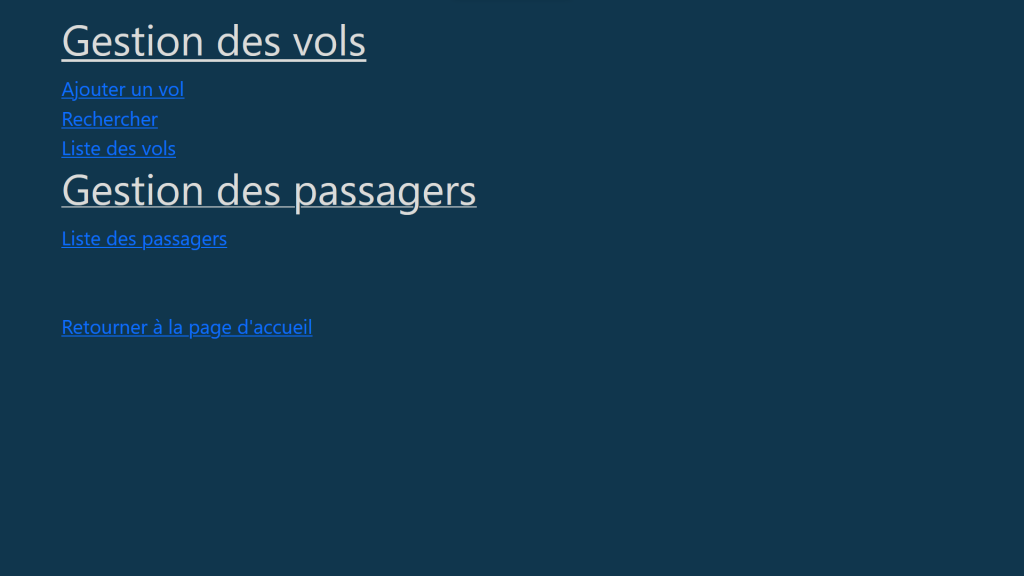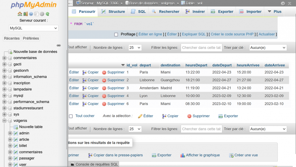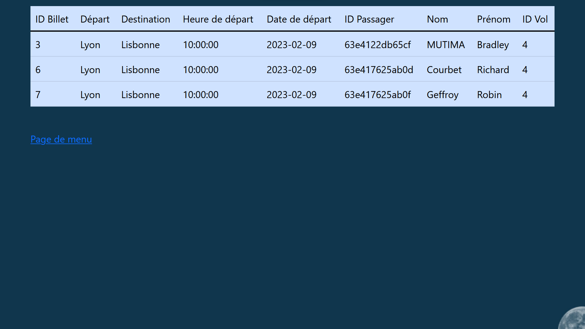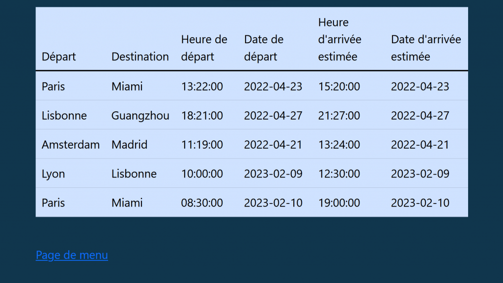 Ici, les vols présents dans la base de données sont automatiquement présentés en front-end.